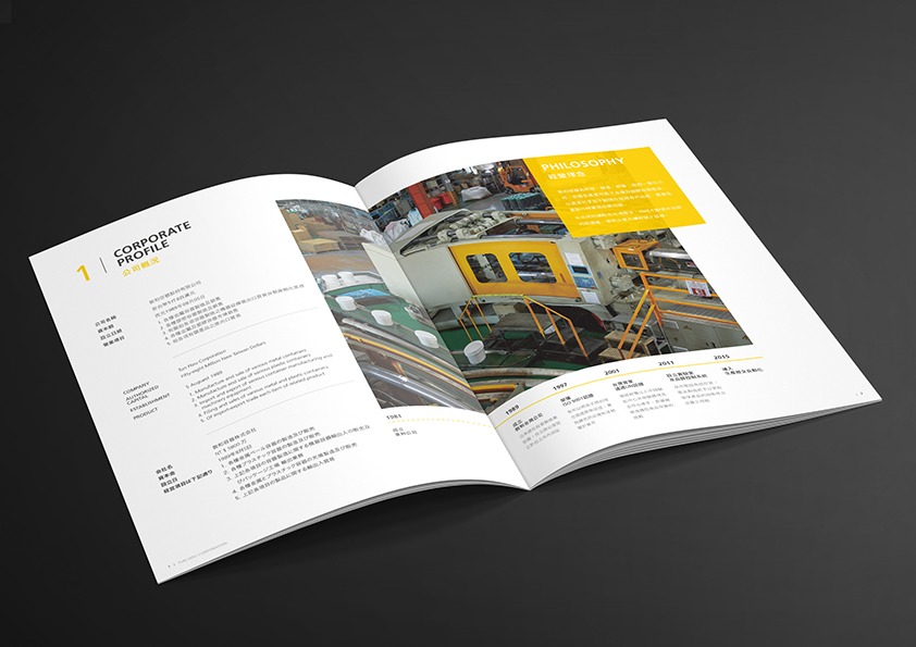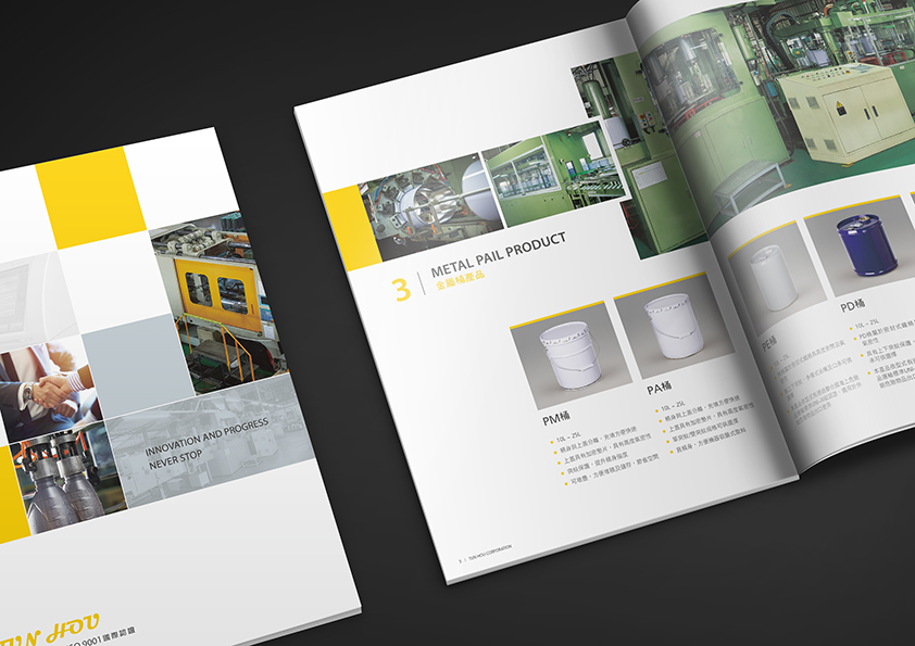 設計團隊以「現代的簡約、清爽的調性、人文的溫度。」三個核心重點出發,建立敦和容器嶄新的企業形象。在整體設計的表現上,我們用黃色與銀灰色做搭配,讓活力、熱情與塑膠工業的企業品牌形象能同時並存,希望讓閱讀者體會到這個品牌是親切又專業,並且是帶有內涵的企業品牌。