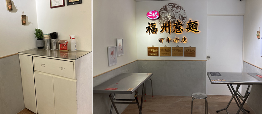 空間設計上,運用大量留白、水泥與木作,並透過燈光改善,使空間增添溫潤感。植栽的擺放,讓空間氛圍更為柔和。空間配置增設備餐台與垃圾收納區,並新增單人座位,讓空間更有效運用。保留老老闆裝置的形象牆,並加以修飾,讓上一代的識別,也能傳承。