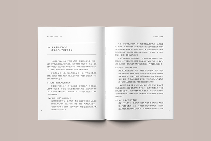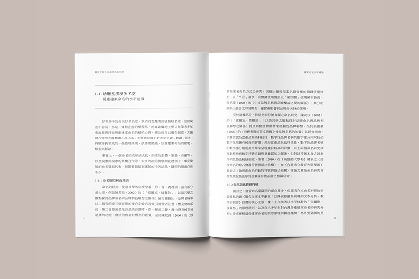 本命名專書為筆者著作《廣告文案水平辭堂:以鑲嵌修辭為前導的文本分析、教學與創作》的別冊,該書有《水開屏》、《字開嗓》、《月開趴》、《貓開花》以及《房開柿》等五個單元,而本書屬於該書五個單元裡最後也最大的單元《房開柿》內容之延續;換言之,本別冊除了有六個章節之外,其實還有個〈章外〉章節,是收錄在該書的尾巴篇章裡。而本書也延續該書「水平修辭」的原則引介與推廣──以鑲嵌辭格為前導,複合運用各種語法結構、修辭辭格以及符號系譜等引導節點來襄助文本的分析、教學與創作,只是本命名專書特別聚焦在筆者多年的研究興趣與目標──品牌命名,特別是台灣房產建案命名的分析與創作。